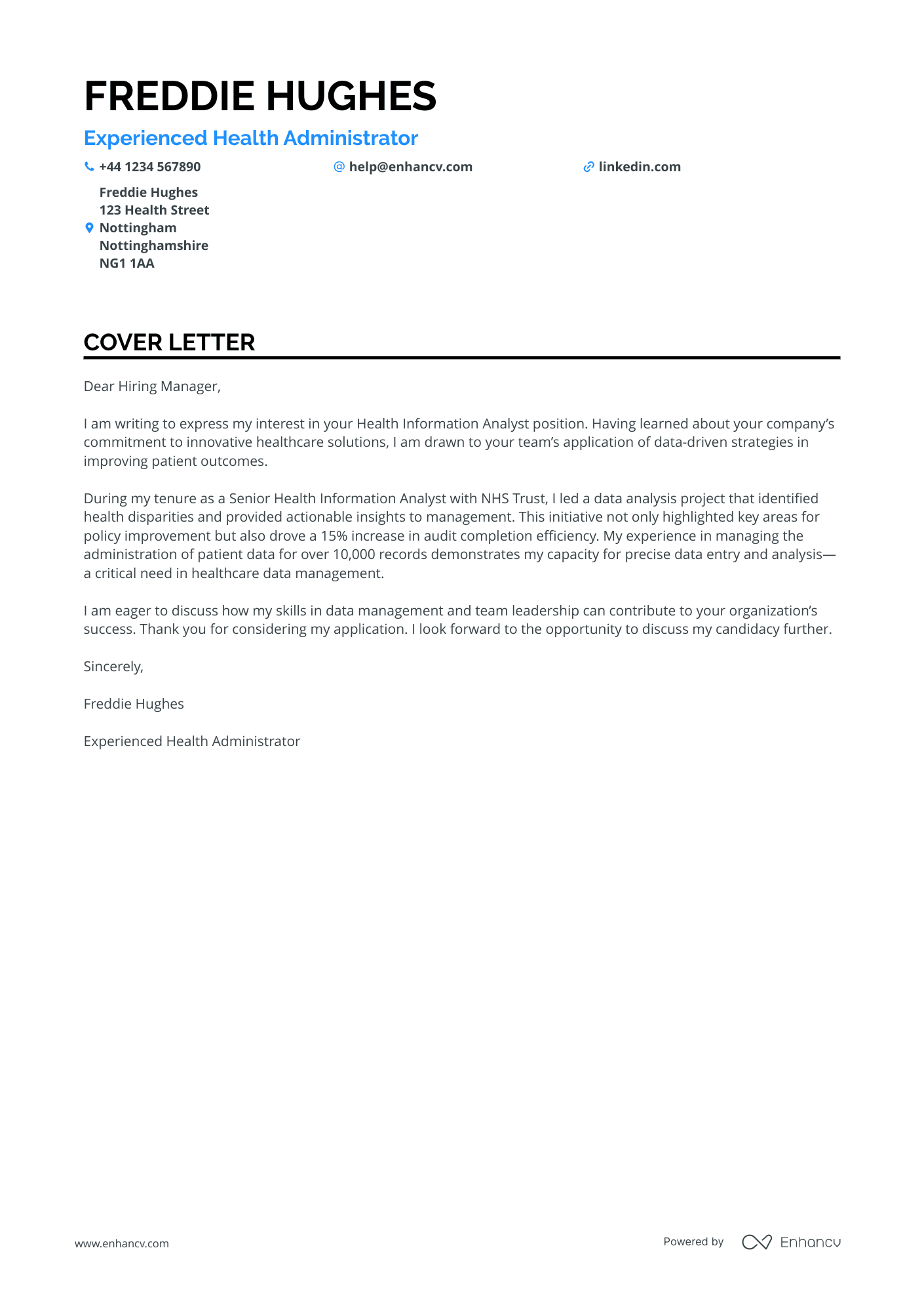 Upload your public health resume to Enhancv's AI, which will quickly scan and prepare a job-winning cover letter for you.